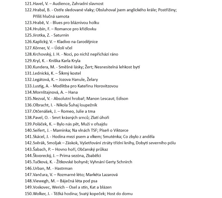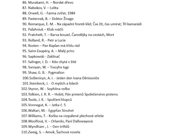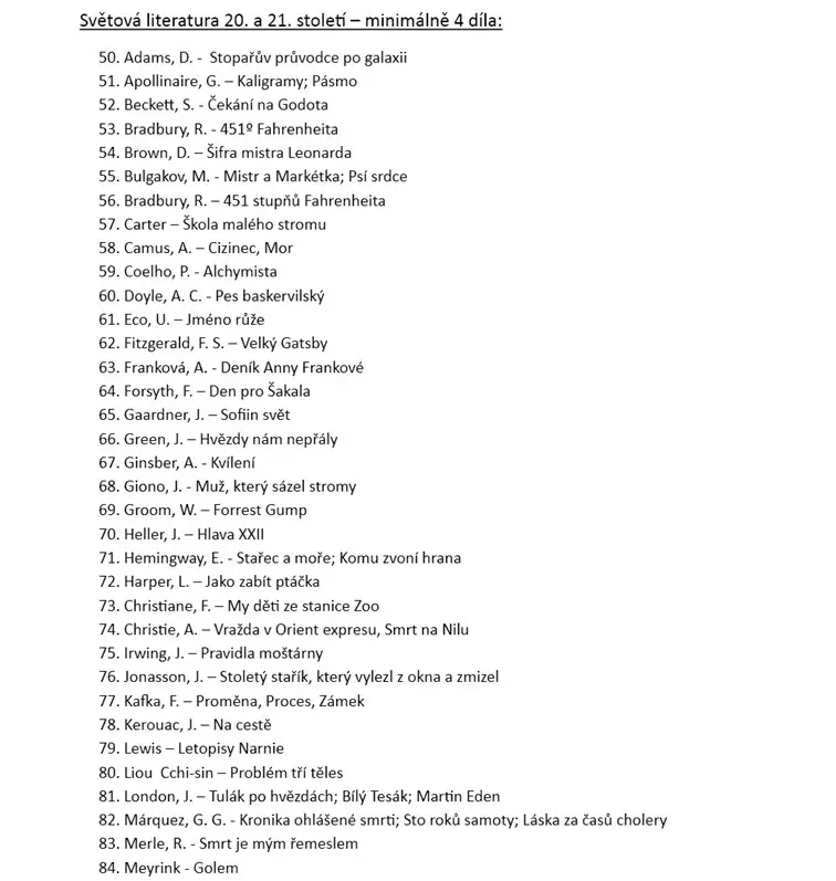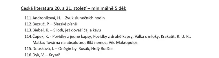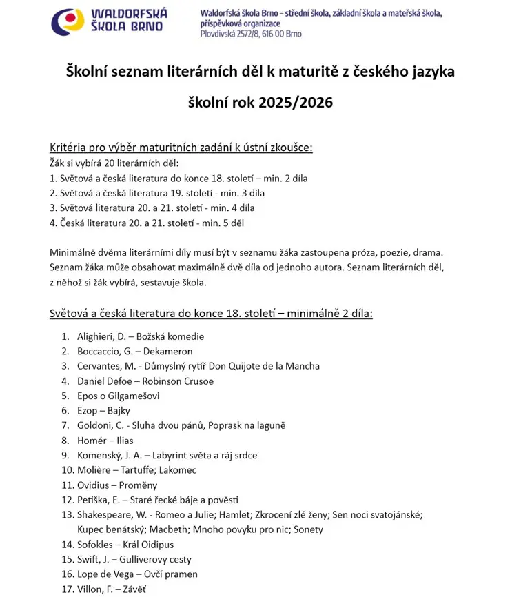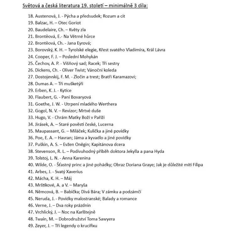 Školní seznam literárních děl k maturitě z českého jazyka pro školní rok 2025/2026 Školní seznam literárních děl k maturitě z českého jazyka školní rok 2025/2026
